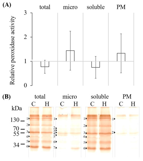 The activity of class III peroxidases was determined in different fractions (total, microsomes, soluble, and PM). The assay contained 775 µL 25 mM sodium acetate buffer pH 5.0, 100 µL 0.3% H2O2 (Co. AppliChem, Darmstadt, Germany), 100 µL 89 mM guaiacol (Co. Merck KGaA, Darmstadt, Germany), and 25 µL protein sample with different protein amount (0.02–50 µg). The turnover of guaiacol to tetraguaiacol (ε470 nm = 26.6 mM−1·cm−1) was measured for 2 min at 470 nm with the UV-1800 spectrophotometer. Values given were from six biological and three technical replicates per sample. The buffer and the two substrates served as a reference.