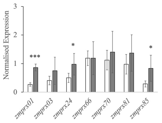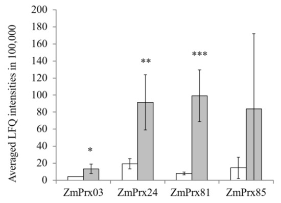 The regulation of the six PM-bound class III peroxidases, identified by gel-free and gel-based analyses, was investigated by real-time quantitative polymerase chain reaction (RT-qPCR) (Figure 5). Although all genes were upregulated, a significant increase was found for zmprx01 (3.2-fold), zmprx24 (1.9-fold), and zmprx85 (2.9-fold), whereas expression of zmprx03 (1.8-fold), zmprx70 (1.3-fold), and zmprx81 (1.4-fold) showed higher levels compared to controls. Additionally, the expression of zmprx66 was not increased in comparison to controls. The housekeeping gene, used in RT-qPCR (zmtufM, Q9FUZ6), could not be found in the RNA Seq data. The NCBI blast with the corresponding sequence led to the protein (NP_001141314) with less than 100% coverage. This protein had a slight non-significant decrease in expression (−1.4-fold change) in RNA Seq analyses, as well as another elongation factor (gene entry 542581, −1.5-fold change).