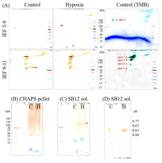 Abundance of guaiacol peroxidases under hypoxia-stress. Plasma membranes (250 µg total protein) of control (C) and 24 h hypoxia-stressed (H) maize roots were solubilized with 8% CHAPS for 1 h. The supernatant was separated on (A) native IEF gels pH 5–8 and pH 9–11 followed by 4–18% non-denaturing polyacrylamide gels in second dimensions. The remaining pellet was either separated on 4–18% non-denaturing gels (B) or solubilized with SB12 (protein-detergent ratio of 1:7) for 1 h. The SB12 supernatant (sol.) was loaded on 4–18% non-denaturing gels (C) and IEF gels pH 9–11 (D). Class III peroxidases were visualized by staining with hydrogen peroxide and guaiacol (orange color). No or only weak signal could be determined in the pellet after SB12 solubilization (data not shown). For MS analyses, gels were stained with TMB (blue color). The protein spots and bands, indicated with red arrows, were identified by mass spectrometry. Molecular weight in kDa was determined using a protein standard (PageRuler Prestained Protein Ladder, Thermo Scientific, Waltham, MA, USA). For further details, see the text. SB12, n-dodecyl-N, N-dimethyl-3-ammonio1-propanesulfonate; CHAPS, 3-[(3-Cholamidopropyl)dimethylammonio]1-propanesulfonate; TMB, 3,3′,5,5′-Tetramethylbenzidine.