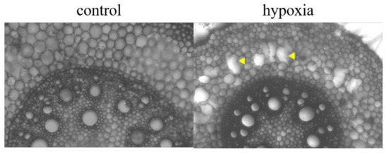 During cross-sectioning, aerenchyma formation in the root cortex was visible in some but not all of the stressed plants, while there were no such signs in control plants (Figure 6).