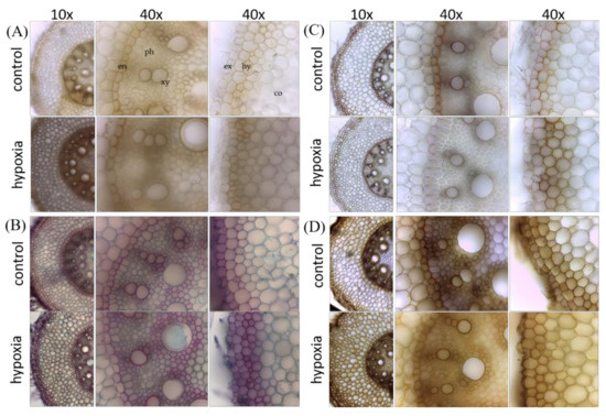 Visualization of lignin, its precursors, and cellulose in the mature zone of primary root cross-sections from control and hypoxia-stressed maize plants. Control and 24 h hypoxia-stressed maize roots were cross-sectioned by hand and analyzed with (A) Mäule staining for syringyl-rich polyphenols (deep-red color), (B) fuchsin, chrysoidin, and Astra blue (FCA) staining for lignified cells (red color) and non-ligneous cells (blue color), (C) Phloroglucinol staining for lignified cells (pink color), and (D) chlorine–zinc–iodine staining for cellulose (violet color). For detailed explanation of the colours, see methods. Co, cortex; en, endodermis; ex, exodermis; hy, hypodermis; ph, phloem; xy, xylem.