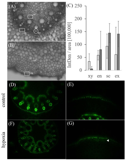 Visualization of suberin in the mature zone of primary root cross-sections from control and hypoxia-stressed maize plants. Control and 24 h hypoxia-stressed maize roots were cross-sectioned by hand and stained with the fluorescent berberine–aniline blue to detect suberin. Images were taken with 10x magnification using an Olympus BHS fluorescent microscope. (A,D,F) Shown is an overview of the central cylinder with vascular bundles and (B,E,F) the cortex and exodermis of maize root transversal section in brightfield image (A,B) and fluorescent image (D–G). (G) White arrow indicates an additional suberin layer beneath the exodermis in stressed samples. (C) Intensity measurements of endodermis (en), exodermis (ex), vascular sclerenchyma cells (sc) and xylem vessels (xy) were calculated as intensity per area (IntDen/area) for controls (white columns) and stressed samples (grey columns). Error bars indicate standard deviation for three to five biological replicates.