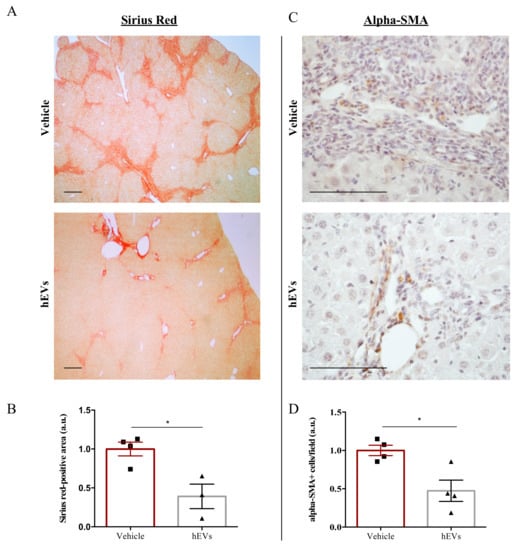 2.2. EVs Have Anti-Fibrotic Properties in the FVB.Mdr2−/− Mouse Model