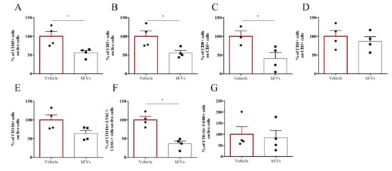 2.3. EVs Reduce Liver Immune Infiltration in the FVB.Mdr2−/− Mouse Model