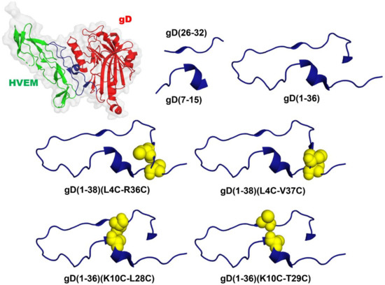 In the crystal structure, gD binding and the HVEM binding β-sheets form a small angle. The conformational analysis revealed that the angle between the β-sheets of gD(1-38)(L4C-V37C) was more parallel to the HVEM chain than found in the crystal structure, while the β-sheets in the gD(1-36)(K10C-T29C)/HVEM complex are perpendicular. In all the presented complexes (Figure 6), similar residues from HVEM protein are involved. 5K, 7D-9Y, 16P-23Y, 30G-35T, 37C, 39P-40C, 75R-76T are common fragments from HVEM protein within 8Å from the binding partner.