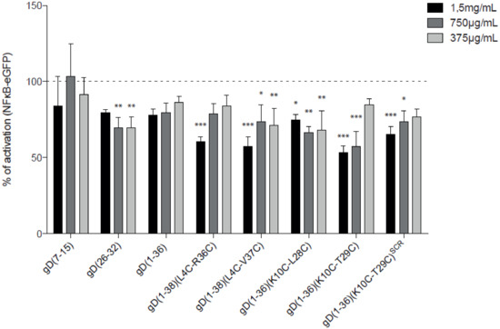 The inhibitory function of the peptides in a reporter cell-based assay. HVEM reporter cells were stimulated with TCS expressing BTLA in the absence or presence of the indicated gD peptides at concentrations of 1.5 mg/mL, 750 μg/mL, and 375 μg/mL. Reporter gene expression (NFκB-eGFP), upon stimulation with TCS-BTLA, was normalized to reporter activation after stimulation with TCS control in the presence of the respective peptides. BTLA/HVEM stimulation in the absence of peptides was set to 100% activation. Results are shown for three experiments performed independently in duplicate. Data are depicted as mean with SEM. * indicates statistically significant differences compared to full activation (100%), two-way ANOVA followed by Bonferroni’s post hoc test; p < 0.0001.