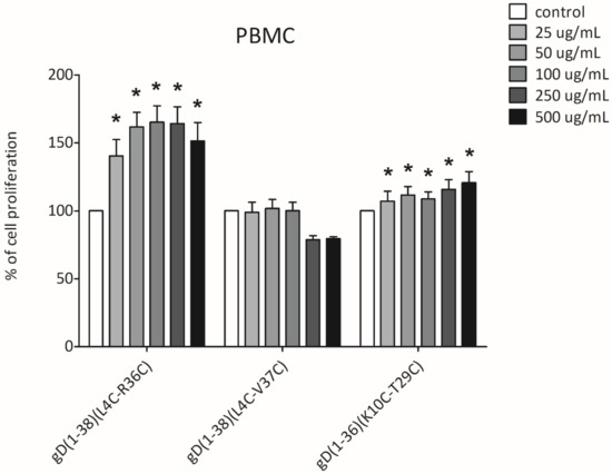 An XTT proliferation assay was used to evaluate the impact of the best peptide inhibitors of BTLA/HVEM complex formation on the proliferation of peripheral blood mononuclear cells. This assay is widely utilized in the measurement of a broad spectrum of biologically active compounds, in order to assess their impact on cell proliferation and, thus, indirectly, cell cytotoxicity [38,39]. The effect of gD(1-38)(L4C-R36C), gD(1-38)(L4C-V37C), and gD(1-36)(K10C-T29C) on cell proliferation, and indirectly cell cytotoxicity, was examined in PBMCs from healthy volunteers. 24 h stimulation with gD(1-38)(L4C-R36C) and gD(1-36)(K10C-T29C) revealed no negative effects in terms of cell cytotoxicity. The only exception was gD(1-38)(L4C-V37C), which caused a small decrease in PBMC proliferation at the highest concentrations used (500 and 250 µg/mL). The other concentrations of gD(1-38)(L4C-V37C) had no impact on PBMC proliferation, as the observed absorbance did not exceed the values obtained in control samples (unstimulated PBMCs). The other two compounds, gD(1-38)(L4C-R36C) and gD(1-36)(K10C-T29C), revealed a rather opposite effect, as the proliferation was significantly increased. The proliferation rate of PBMCs stimulated with gD(1-38)(L4C-R36C) even exceeded 150% over a concentration range of 50-500 µg/mL. In the case of gD(1-36)(K10C-T29C) this effect was less spectacular, as the proliferation of PBMC was enhanced by about 25% (at 250 and 500 µg/mL) (Figure 5).