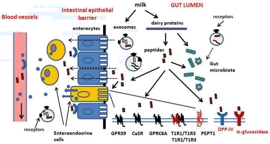 | Caseins Whey proteins | DPP-IV inhibitory peptides LKPTPEGDL, LPYPY, IPIQY, IPI, WR LPQNIPPL | -inhibit DPP-IV protease activity in vitro -possible delay of incretin hormone (GLP-1 and GIP) degradation and improvement of the control of postprandial glucose levels (systemic effect), -possible local action as inhibitors of DPP-IV activity in the gut (brush border of intestinal mucosa and gut microbiota) No clear evidence of their passage across the intestinal epithelial barrier into circulation -DPP-IV inhibitors in vitro, can cross an epithelial cell monolayer (Caco-2 cells) in vitro -DPP-IV inhibitor in vitro, improves postprandial glucose control in rats | [49,50,51,52,125,126] [134] [126,129] [8,132] |