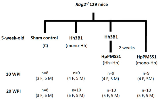 A group of 38 mice (20 males, 18 females) was orally gavaged every other day with 3 doses of 0.2 mL (~2 × 108 organisms per dose) of Hh 3B1 (ATCC 51449); a sub group of Hh-infected mice (n = 19) received three doses of Hp strain PMSS1 (~2 × 108 organisms per dose), 2 weeks later [40]. Additionally, 19 age-matched mice (10 males, 9 females) were inoculated with Hp alone; 16 sham control mice (10 males, 6 females) were dosed with vehicle (Figure 1). The individual groups were defined as follows: (1) mono-Hh for Hh alone; (2) mono-Hp for Hp alone; (3) Hh+Hp for dual infection with Hh and Hp.