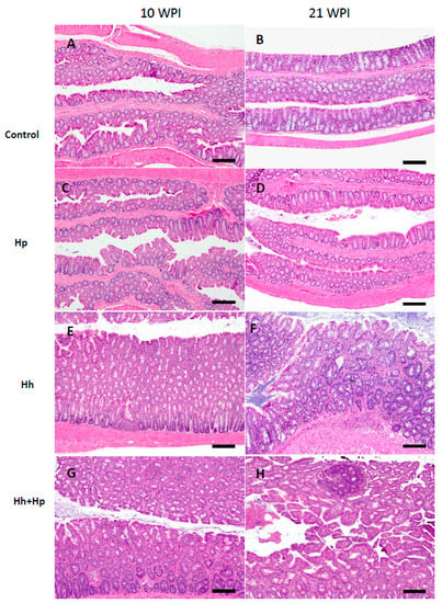 - Lemke, L.B.; Ge, Z.; Whary, M.T.; Feng, Y.; Rogers, A.B.; Muthupalani, S.; Fox, J.G. Concurrent Helicobacter bilis infection in C57BL/6 mice attenuates proinflammatory H. pylori-induced gastric pathology. Infect. Immun. 2009, 77, 2147–2158. [Google Scholar] [CrossRef]