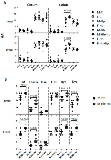 There were no significant differences in cecal and colonic HAI (Histologic Activity Index) scores between mono-Hh and Hh+Hp females at both time-points (Figure 3A, Figures S2 and S3). However, the Hh+Hp males had comparable cecal HAI scores, but had significantly higher colonic pathology HAI scores compared to mono-Hh males at both time-points (Figure 3A, p < 0.05). For sub-categorical colonic lesions including inflammation, edema, crypt atrophy, epithelial defect, hyperplasia, and dysplasia, Hh+Hp males developed only more severe edema at 10 WPI compared with mono-Hh mice (Figure 3B, p < 0.05). At 21 WPI, colonic dysplasia was significantly more severe in Hh+Hp males compared to mono-Hh males (Figure 3B, p = 0.02); inflammation (p = 0.086), edema (p = 0.06) and hyperplasia (p = 0.08) in Hh+Hp males tended to be more severe than those in mono-Hh males. Additionally, dysplasia (p < 0.02) and hyperplasia (Figure 3B, p = 0.076) were more severe in the colon of Hh+Hp males at 21 WPI compared to 10 WPI; there were no significant differences in severity of colonic dysplasia and hyperplasia in mono-Hh females between these two time-points (Figure 3B, p > 0.1). These results indicate that co-infection with Hp significantly promoted progression of Hh-induced colonic carcinogenesis in RAG2 males.