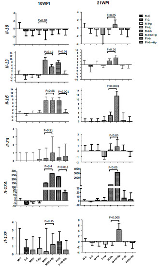 2.2. Males Co-Infected with Hp Produced Higher mRNA Levels of Colonic Cytokines Involved in the Development and Function of Innate Lymphoid Cells 1 and 3