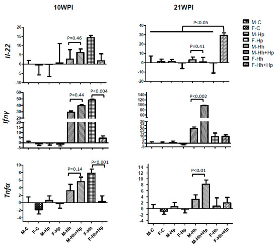 Since there was no significant difference in promoting severity of cecal pathology by Hh+Hp infection, mRNA expression of selected key cecal cytokines including Il-1β, Tnfα, Ifnγ, Il-17A, Il-13, iNos, Il-6, and Il-10 were examined (Figure S5). Hh+Hp males had significantly higher mRNA levels of cecal Il-17A and iNos compared to mono-Hh males at 10 WPI but not at 21 WPI, whereas there were no significant transcriptional differences for the remaining gene targets (Figure S5). At 10 WPI, mRNA levels of cecal Il-1β, Tnfα, Ifnγ, Il-17A, Il-13, iNos, and Il-6 were significantly higher in Hh-infected mice, irrespective of Hp infection or sex, except for Il-13 in Hh+Hp females and Il-6 in the mono-Hh females, when compared to the sham control or mono-Hp mice of both sexes (Figure S5, p < 0.05 or lower). The Hh+Hp females had significantly more expression of cecal Il-13 compared to the sham controls, while cecal Il-6 mRNA levels were comparable between the mono-Hh female and the sham controls or mono-Hp mice (Figure S5). At 21 WPI, Hh-infected mice contained higher mRNA levels of cecal Ifnγ, Il-1β, Il-17A and iNos compared to the sham controls or mono-Hp mice (Figure S5, p < 0.05 or lower). Interestingly, female controls produced significantly lower mRNA levels of cecal Tnfα, Il-1β, and Ifnγ compared to the male counterparts; mono-Hp males contained lower mRNA levels of cecal Tnfα compared to the sham males (Figure S5, p < 0.02 or lower). For cecal Il-10 mRNA levels, Hh+Hp females contained significantly higher mRNA levels of cecal Il-10 compared to the sham females (p < 0.005) or mono-Hh females (p < 0.003) at 10 WPI (Figure S5); there were significantly higher mRNA levels of cecal Il-10 in mono-Hh females compared to the sham females at both time-points (Figure S5, p < 0.04).