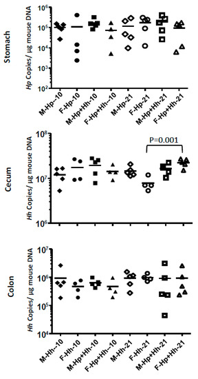 Colonization levels of gastric Hp or intestinal Hh were determined by qPCR. Average levels of Hp in stomach were approximately 1 × 105 per µg mouse DNA (Figure 5). There was no statistical difference in gastric Hp levels between Hh+Hp and mono-Hp groups or sexes in the same group at both time-points. Average colonization levels of cecal Hh were ~107 organisms per µg mouse DNA, which is about 10-fold higher compared to those in the colon. There was no statistical significance in cecal Hh levels between mono-Hh infected and Hh+Hp mice or sexes at 10 WPI. At 21 WPI, co-infected females had higher cecal Hh levels compared to mono-Hh females (Figure 5, p = 0.001). There was no statistical significance in Hh colonization levels between the sexes or infection status at either time point in the colon.