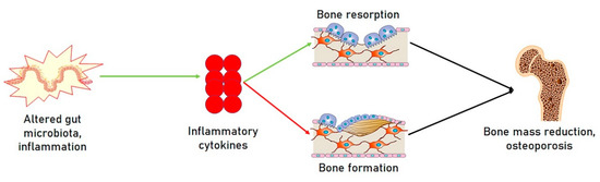 Different mechanisms of dysbiosis inducing osteoporosis have been hypothesized, such as a dysregulation of the immune–inflammatory axis [28]. Gut-mediated inflammation, with the intervention of inflammatory cytokines, plays a role in the activation of osteoclasts, favoring the appearance of osteoporosis [29]. The gut microbiome mediates osteoporosis pathogenesis by largely involving the immune system. Clostridium promotes the accumulation of Tregs, which are inhibitors of osteoclast differentiation, in the lamina propria of the colon [30]. A lack of Clostridium strains caused a reduction in Foxp3 Treg levels with an increase in bone loss [31].