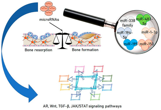 Selected microRNAs are known for balancing between bone resorption and formation, having a role in osteoporosis and for targeting several signaling pathways, including Androgen receptor (AR), Wnt, TGF-β, JAK/STAT signaling pathways.