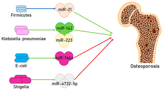 Current searches on the microbiota indicate its participation in the onset of different diseases through modulating the microbiota–gut axis, microbiota–brain axis, microbiota–liver axis, microbiota–lung axis, and microbiota–vascular axis [82]. Numerous experiments have also demonstrated the presence and actions of a microbiota–bone axis capable of inducing the onset of osteoporotic disease. The systems by which an altered microbiota can participate in the progression of osteoporosis diseases are manifold, and, among these, a fundamental moment could be constituted by the ability of the microbiome to intervene in the expression and functioning of miRNAs.
