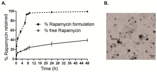 (A) Release study of rapamycin formulation for 48 h. (B) Transmission electron microscopy image of encapsulated Rapamycin (Black dots).