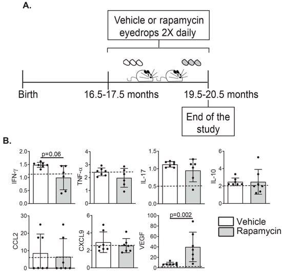 Schematic of the experimental set-up and immunological profile in the tears of the aged mice, and changes after treatment with Rapamycin eyedrops. (A) C57BL/6 mice aged about 17 months were instilled either with empty micelles or rapamycin BID for three months, when they were harvested to collect the tissues for further evaluation. (B) Tear washings were collected from the aged mice at harvesting and the levels of pro-inflammatory cytokines, chemokines, and VEGF-A in tears were evaluated using multiplex Luminex (n = 6–7/group, error bars indicate the standard deviation (SD) of the mean, Mann–Whitney test). The discontinuous line indicates the detection limit of the assay.