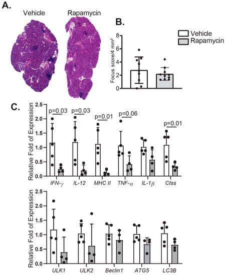 Lacrimal glands undergo structural changes and dysfunction with aging [,]. One of the most evident changes is the increasing infiltration of immune cells in the gland [,]. To investigate the impact of rapamycin eyedrops in the eye of aged mice, we excised the extra-orbital lacrimal gland after treatment in both groups and processed for histologic evaluation and gene expression analysis. After Hematoxylin and Eosin staining, we counted the total amount of lymphocytic infiltration in these tissues. Although we found no significant decrease in the focus score in either vehicle- or rapamycin-treated mice, a tendency towards less inflammation was observed (Figure 3A,B). This was accompanied by significantly decreased levels of inflammatory marker transcripts, such as IFN-γ, IL-12, MHC II, and Cathepsin S (Ctss) in this tissue after rapamycin treatment (Figure 3C). An evident, although not significant, decrease in the level of TNF-α and IL-1β mRNA was also observed.