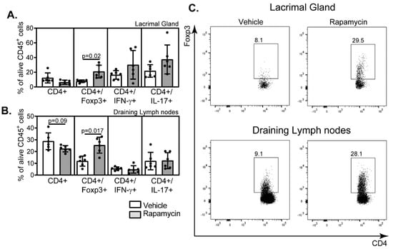 Effector immune cells in either the lacrimal gland or the draining lymph nodes of the rapamycin-treated aged mice. Either lacrimal glands (A) or the draining lymph nodes (B) from mice instilled BID either with vehicle or rapamycin eyedrops for three months were collected, and single-cell suspensions were obtained, to then subject them to stimulation with PMA + Ionomycin in the presence of a protein transport inhibitor as indicated in Materials and Methods. Then, cells were extracellular and intracellularly stained with fluorescent-antibodies as indicated. After gating out the death cells labeled with a fluorescent reactive dye, CD45+ leukocytes were selected, and among them, percentages of CD4+ cells expressing either Foxp3, IFN-γ or IL-17A were determined. (C) Representative dot plots of the percentages of CD4+Foxp3+ cells in the vehicle- or the rapamycin-treated mice in either the lacrimal gland or draining lymph nodes are shown. Squares within the dot plots enclosed the CD4+Foxp3+ subpopulation, and the numbers in the left corner indicate the percentages (n = 6/group, in (A,B), with each dot representing one animal; error bars indicate the standard deviation (SD) of the mean, Mann–Whitney test).