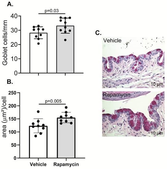 One of the most prominent changes in the ocular surface during aging is the progressive loss of goblet cells in the conjunctiva [,], that secrete mucins and immunomodulatory factors [,] further contributing to the lubrication and homeostasis of the eye. This is related to increased expression of pro-inflammatory cytokines, particularly IFN-γ, which is directly involved in goblet cell loss during desiccation and in aging [,]. Since we observed immunosuppressive effects of daily topical instillation of rapamycin in the eye, we proceeded to quantify goblet cell numbers in the upper and lower conjunctiva in aged mice treated with either vehicle or rapamycin eyedrops for the prior three months. Goblet cell density was chosen as an efficacy parameter because of the responsiveness of these cells to an inflammatory milieu [,]. We observed that rapamycin instillation significantly prevented the aging-related goblet cell loss in the conjunctiva. Moreover, goblet cells were not only increased in number, but they also showed more mucin content, as evaluated by the cell area in um2 (Figure 5).