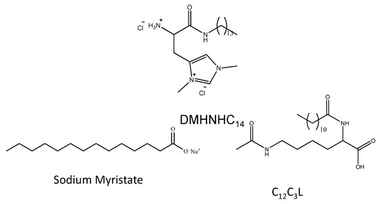 Deuterated methanol was purchased from Eurotop (Cambridge, UK). Mueller-Hinton Broth was purchased from Difco Laboratories (Detroit, MI, USA). Water from a Milli-Q Millipore system (Millipore, Burlington, MA, USA) was used to prepare aqueous solutions. Sodium myristate was from Sigma (San Luis, MO, USA). The N(π),N(τ)-bis(methyl)-L-Histidine tetradecyl amide (DMHNHC14) was synthesized in our laboratory following a three-step procedure [15]: (a) Synthesis of N(α)-Cbz-N(π),N(τ)-bis(methyl)-L-Histidine using (CH3)2SO4 (Sigma, San Luis, MO, USA) as a methylating agent, (b) preparation of the N(α)-Cbz-N(τ),N(π)-bis(methyl)-histidine tetradecyl amide simply heating the first intermediated with the tetradecyl amine (Sigma, San Luis, MO, USA) and (c) catalytic hydrogenation of intermediate 2 using Pd over charcoal (Sigma, San Luis, MO, USA). The detailed synthetic procedure as well as the characterization of DMHNHC14 High-Performance Liquid Chromatography (HPLC), Mass spectrometry (MS) and (NMR) are provide elsewhere [15]. The Nα-lauroyl-Nεacetyl lysine (C12C3L) was obtained with a purity of 99% by the condensation of the dodecyl chloride (Sigma, San Luis, MO, USA) to the ε-amino group of the commercial acetyl-lysine. Its characterization is shown in the Supporting Information (Figures S9–S13).
