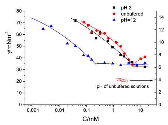 In the three conditions described, the DMHNHC14 surfactant reduces the surface tension of water at small concentrations. We observe that both the unbuffered and acid pH yield similar plots. The unbuffered pH plots show a clear minimum while the plot for pH = 2 is closer to what it would be expected for a pure surfactant; that is, surface tensions plots show a break point that splits them into two parts, the first one with a negative slope and a second one with an almost constant surface tension. The break point concentration is usually identified as the critical micellar concentration (CMC) [22]. However, since surface saturation can result in formation of non-micellar aggregates, the break point does not necessarily correspond to a true CMC. Therefore, we will name this break the apparent surface tension CMC or Surface Tension critical micellar concentration (ST CMC). A minimum in the surface tension-concentration curves is usually attributed to the presence of traces of species which are more hydrophobic than the surfactant under consideration [22]. Results described in Figure 2 do not fit within this framework because if the singly charged species is that with the highest hydrophobic behavior, we would expect the minimum to occur at a somewhat smaller concentration than the ST CMC for the doubly charged surfactant. Moreover, we would expect the surface tension of the doubly charged species to be close to the unbuffered case. If this is not the case, then the presence of this minimum for the unbuffered sample should have a different origin, however, we do not have an explanation for this behavior. Additionally, it is quite notable the reduction of the apparent CMC for basic pH. The break is found more than one order of magnitude below that of the acidic of unbuffered conditions. This difference seems strong at a first glance but, a look at the scarce literature devoted to dicationic surfactants seems to confirm this trend. Examples are given in Reference [10], where the ratio CMC of single trimethylammonium compared to double head trimethylammonium bromide is 20 while the same ratio with pyridinium is 14 instead. The work in Reference [9] reports that dicationic charge long-chain C18 gave a ratio of 8 using an extrapolated value for the single charged species (C18 = 2 mM). However, in Reference [11], authors describe that the ratio for mono and dialkyl quaternary ammonium surfactants was only about 2.