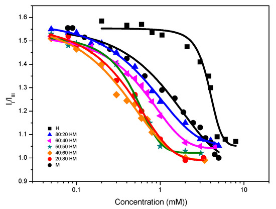 We have also followed the aggregation process by fluorescence. The II/IIII ratio is shown as a function of concentration for the pure surfactants and their mixtures in Figure 4.