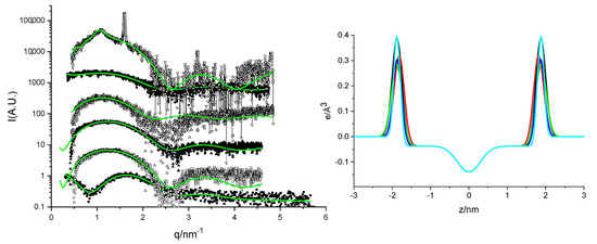 The systems were also characterized by means of SAXS. Figure 6 shows the scattering curves together with lamellar best fits except for pure DMHNHC14, which was fitted to core-shell polydisperse spheres. The electronic profiles corresponding to these fits are also shown in Figure 6. We can observe that, although the fits are not perfect, they are quite accurate. The structure of the bilayers sensed by SAXS is quite constant, which agrees with the nearly constant “vesicle” composition obtained from fluorescence and the Rubingh model. The sample with highest myristate content shows a sharp peak at q = 1.6 nm−1 (second and third order reflexions visible over the background) and a secondary peak at q = 1.09 nm−1. The last peak can be fitted using the multilamellar model of correlated bilayers with a repetition of about 10 bilayers and repetition distance of 57 nm. The sharp peak could be due to the presence of myristate crystallites [24]. The rest of the curves could be fitted with non-correlated lamellae. Differences correspond with the different stability of both types of samples. The pure cationic surfactant could be fitted to a core shell model in which the hydrophobic radius is 1.84 nm and the hydrophilic corona thickness is 0.88 nm. This corresponds to an aggregation number of 64 and an area per molecule of 0.66 nm2, which fairly agrees with that measured by surface tension. The hydrophilic shell volume and electronic density agree with a hydration degree per polar head of about 17 water molecules.