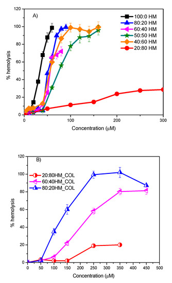It has been reported that the incorporation of cholesterol into vesicular bilayers can modify vesicular membrane permeability and modifies their biological properties [37,38]. Based on the above considerations, we decided to study whether the addition of cholesterol to our catanionic mixtures can improve the mixtures’ biocompatibility. Figure 7B depicts the percentage of hemolysis against concentration for HM formulations containing cholesterol. Plots show that the incorporation of cholesterol to the catanionic vesicles substantially decreases the efficiency of these systems to lyse the erythrocytes membrane. Two different factors could explain this behavior: (1) the decrease of the cationic surface charge in the vesicles promoted by the addition of cholesterol, and (2) the similarity between bilayers containing cholesterol and the erythrocyte membranes. Results obtained in this work agree with those obtained recently for catanionic systems prepared with arginine-based gemini surfactants. In Pinazo et al. [33], it was found that the hemolytic activity of these formulations mainly depended on the proportion of cationic surfactant. Moreover, it was also observed that the incorporation of cholesterol into the catanionic vesicles resulted in a significant decrease in their hemolytic activity. The toxicity of the cationic dioctadecyl-dimethyl-ammonium bromide was also severely reduced when this surfactant was formulated with cholesterol and phosphatidylcholine [39].