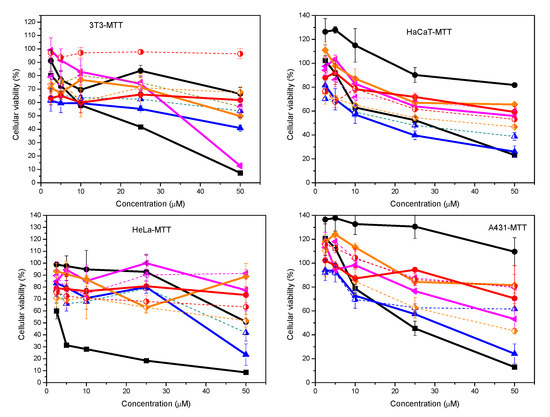 Cellular viability (%) as a function of concentration for different cellular lines using the MTT test:
