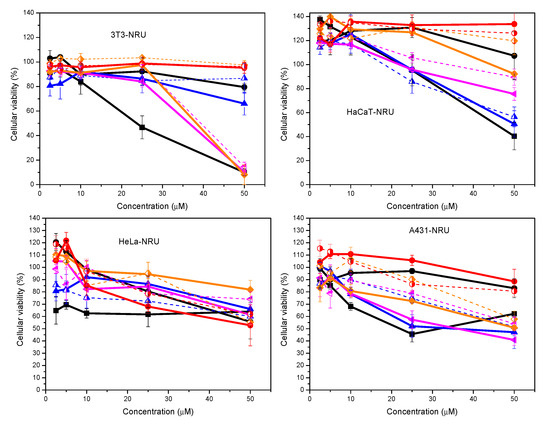 Cellular viability (%) as a function of concentration for different cellular lines using the NRU test: