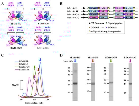 We previously designated the VH and VL regions of the humanized anti-EGFR antibody 528 as h5H and h5L [], and the humanized anti-CD16 antibody 3G8 as h3GH and h3GL [], as well as reported the construction of bacterial co-expression vectors for hEx3-Dbs with different domain orders []. Following the same procedure as for hEx3-Dbs, we constructed bacterial co-expression vectors for hEx16-Dbs with the following four different domain orders: pRA-hEx16-HL for hEx16-HL, in which both chimeric single-chain components are in the VH–VL order; pRA-hEx16-LH for hEx16-LH, in which both chimeric single-chain components are in the VL–VH order; pRA-hEx16-3G/5 for hEx16-3G/5, in which both the V regions of the humanized anti-CD16 antibody 3G8 are located at the N-terminus; and pRA-hEx3-5/3G for hEx3-5/3G, in which both the V regions of the humanized anti-EGFR antibody 528 are located at the N-terminus.