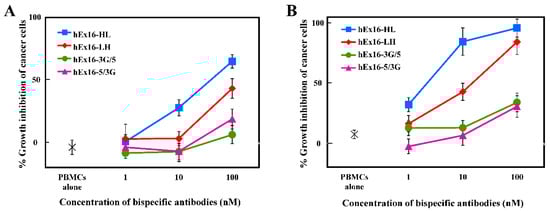 Growth inhibition of EGFR-positive TFK-1 cells by hEx16-Dbs. The purified hEx16-Dbs were added with peripheral blood mononuclear cells (PBMCs) to TFK-1 cells and growth inhibition was evaluated using the MTS assay. The ratio of TFK-1:PBMC was either (A) 1:30 or (B) 1:80.