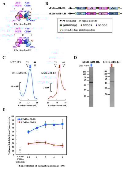 Preparation and evaluation of hEx16-scDbs with different domain orders. (A) Schematic diagrams of the two types of hEx16-scDbs: hEx16-scDb-HL and -LH. (B) Schematic diagrams of the vectors designed for the two types of hEx16-scDbs. (C) Gel filtration chromatographs of hEx16-scDbs and (D) SDS-PAGE analysis of monomer fractions indicated by arrows. mAU, milli-absorbance unit. (E) Growth inhibition of EGFR-positive TFK-1 cells by hEx16-scDbs. The purified hEx16-scDbs were added with the NK-92/CD16A cell line to TFK-1 cells. The ratio of TFK-1:NK-92/CD16A was 4:1.