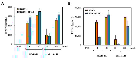 Each hEx16-Db, at a final concentration of 10 or 100 nM, was co-cultured with PBMCs (4.0 × 105 cells), in the presence or absence of overnight-adhered TFK-1 cells (5.0 × 103 cells), in 96-well plates. After 24 h, supernatants were harvested and used in enzyme-linked immunosorbent assays (ELISA), for IFN-γ and TNF-α, according to the manufacturer’s instructions (ELISA Ready-SET-Go!, Bay Bioscience, Hyogo, Japan).