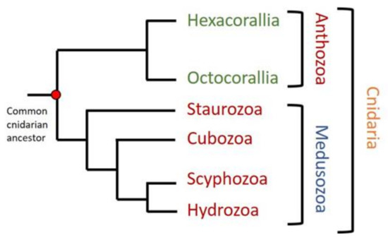 Cnidaria is the oldest linage of venomous animals. Its study from the evolutionary and phylogenetic point of view is interesting in order to fill the gaps in most general genetic and phylogenetic studies focused not only on venom evolution [11], but also in the appearance of the nervous system or the generation of bilateralism [102,103]. This phylum comprises about 10,000 different aquatic species, most of them living in salt water. The phylum contains two main groups. Anthozoa is a class that includes sea anemones and corals, species living as sessile polyps. It is subdivided into the subclasses Hexacorallia and Octocorallia, according to their different radial body symmetries. The other group is the subphylum Medusozoa, which comprises four other classes: Hydrozoa (Hydra and colonial polyps), Scyphozoa (true jellyfishes), Cubozoa (box jellyfishes), and Staurozoa (Stalked jellyfishes) (Figure 1). Medusozoa have a life cycle including polyp and medusa stages, while Anthozoa occur only as polyps [103,104,105]. Most of these animals are venomous and clinically relevant. The consequences of their sting vary from nonhazardous symptoms like burning feeling, itching, and redness, typically caused by sea anemones and corals [81], to important grievances like severe pain, cardiovascular distress, and loss of consciousness caused by the most dangerous species like the Australian box jellyfish (Chironex fleckeri) [106,107,108].