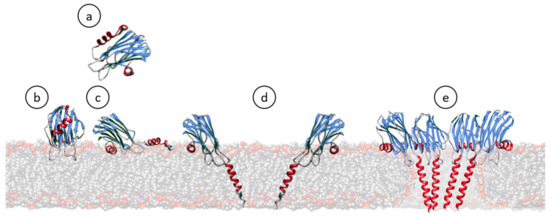 Cartoon schematic representation showing most of the steps generally accepted for the pore formation mechanism of actinoporins. In solution, they remain soluble and stably folded (a) [26,110,124,127,136,137,138,139]. Upon interaction with a lipid membrane containing SM (b), their N-terminal α-helix stretch is detached and extended, shortly laying parallel to the membrane (c) [25,26,82,85,87,91,116,140,141,142,143]. Then, monomers oligomerize and insert this N-terminal α-helix, now about 30 residues long, within the hydrophobic membrane core (d) [34,144,145,146,147,148,149]. The existence of such an intermediate is one of the most controversial issues, depending on the degree of acceptance of the evidence about the real existence, or not, of pre-pore assemblies [132,133,150]. Finally, a cation selective channel is established (e) [39,116,128,136,144,151].