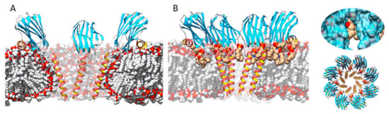 Two of the main models representing the pore structure of actinoporins. (A) A tetrameric one in which the membrane adopts a toroidal shape around the pore walls (made using StnII model 1GWY fitted to the structure of FraC from model 4TSY), and (B) an octameric lipid–protein structure (FraC pore, PDB ID: 4TSY) in which lipids (carbon atoms in tan color) are accommodated through pore wall fenestrations. Inserts on the right show a close-up of a lipid on a fenestration (top) and a top view of the octameric complex (bottom). Adapted from [32]. The α-helices are depicted in red and gold, β-sheets in blue, nonperiodic structures in grey. Bulk lipids are depicted in grey (carbon atoms) and red (oxygen atoms).