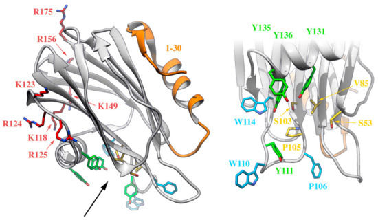 Four different functionally relevant regions can be distinguished in the water-soluble monomeric actinoporins, as depicted on this representation of the three-dimensional structure of StnII (PDB: 1GWY). The N-terminal stretch (in orange), an array of exposed and basic amino acids (in red and blue), a cluster of aromatic residues (in light blue, except the Tyr residues also belonging to the POC site, which appear in green), and the POC binding site (in yellow or green). Residues taking part in both the cluster of aromatic residues and the POC binding site are highlighted in green. The black arrow on the left panel indicates the point of view of the right panel, which is a close-up of the cluster of aromatic residues and the POC binding site.