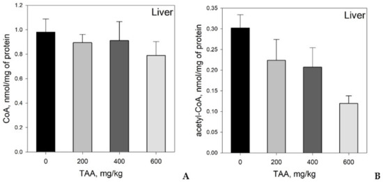 (A) Distribution of CoA and (B) acetyl-CoA in the livers of rats administered different doses of TAA. Data are given as AVG ± STDEV in nmol/mg protein.