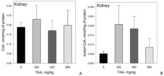 Kidney: The distribution of both coenzymes in rat kidneys was significantly different from that in plasma and livers. It is interesting to note that the renal acetyl-CoA concentrations among the groups of TAA-induced animals was different compared to those of livers. A noticeable increase in the concentration of acetyl-CoA was observed with low and medium doses of TAA administration, while at a higher dose of TAA (600 mg/kg), its level decreased.