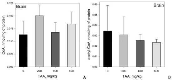 (A) Distribution of CoA and (B) acetyl-CoA in the brains of rats administered different doses of TAA. Data are given as AVG ± STDEV in nmol/mg protein.