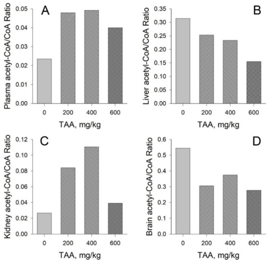 In the plasma and kidney tissues of rats (Figure 5A,C), the change in the acetyl-CoA/CoA ratio depends on the dose of the administered toxin and is markedly different between liver and brain (Figure 5B,D). Thus, the data presented in Figure 5 show that the ratio of acetyl-CoA/CoA in kidney and plasma samples of TAA-treated rats is higher than that in the controls. However, this relationship is not linear. The highest ratio values were obtained for animals administered low and medium doses of TAA (200–400 mg/kg). However, in the group of animals administered a high dose of TAA (600 mg/kg), the acetyl-CoA/CoA ratio is lower than that in the groups administered low and medium doses, but higher than that in the control group. In the kidneys and blood plasma, the maximum difference in the acetyl-CoA/CoA ratios between the control group and the group of TAA-treated animals (400 mg/kg) was 0.03–0.11 for the kidneys and 0.019–0.050 for plasma.