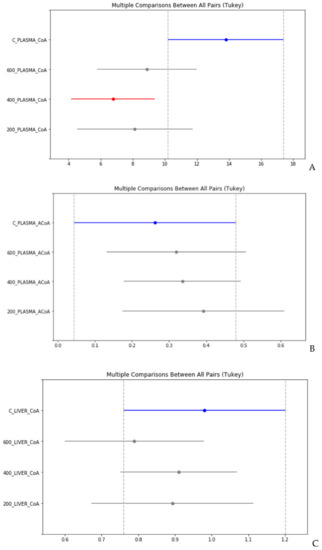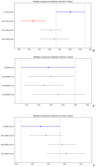 Multiple comparisons between all pairs (Tukey) for CoA and acetyl-CoA in plasma (A and B, respectively), in liver (C and D, respectively), and in kidney (E and F, respectively). C, control; 200, 400, 600, TAA concentration (mg/kg).