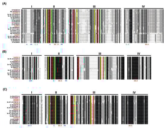 Multiple sequence alignment for plant trans-PTs. The deduced amino acids of the representative PTs in subgroups I–III were aligned using the standard parameters of the ClustalW algorithm, as shown in (A–C), respectively, and four kinds of highly conserved regions (I–IV) were displayed using GeneDoc program. The conserved amino acids are presented below with the blue letter, and the conserved sequences of FARM (first aspartate-rich motif) and SARM (second aspartate-rich motif) are marked with red letters. The floor 1, 2 and 3 residues of the “three floors” model [13] are colored green, red and yellow, respectively. The information of plant trans-PTs are listed in Supplementary Table S4.