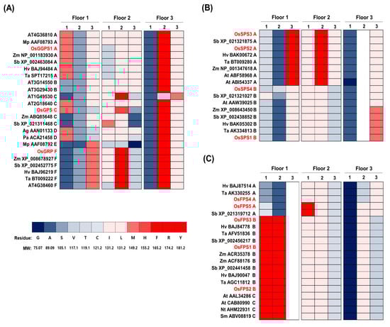 The better matches with the classification patterns of subgroups were observed in Floor 1 and 2 of Group I and Group II (Figure 3). GGPS_LSUs (subgroup A) have the same amino acid residue weight in each position of Floor 1 and Floor 3, but GGPS_LSU (subgroup A), which includes OsGGPS1, has a distinguishing light V residue (MW: 117.1) at the first position of Floor 2, instead of a heavy I residue (MW: 131.2) and GFPS (subgroup B) has a light S residue at the first position in Floor 1, supposing their differentially biochemical functions. Moreover, the two subgroups of GPS (D) and G(G)PS (C) showed the highest variation in Floor 1 and 2, compared with other PTs, but interestingly, two gymnosperm homomeric GPSs (Ag AAN01133 and Pa ACA21458) and one rice GPS (OsGPS) had the same residues in Floor 1, supposing their similar biochemical functions. Lastly, two GGPS_SSUs (subgroup E and F) have the same heavy M residue at the third position of Floor 1 and GGPS_SSU-II (subgroup F), which includes OsGRP, has specifically a heavy F residue at second position in Floor 2. In Group II, subgroup A, which includes OsSPS2 and 3, contained an F residue (MW: 165.2) in each of Floor 1 and 2, while subgroup B, which includes OsSPS1 and 4, had an L residue (MW: 131.2) in the same position (Figure 3B). In Group III, the first two residues of Floor 1 in subgroup A, which includes OsFPS4 and 5, were observed to be quite different as the light residues S and A (MW: <105.1), compared with the heavy residues of F and Y in subgroup B and C (Figure 3C).