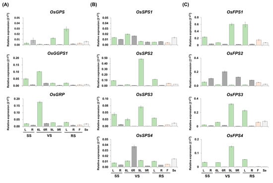 To profile the expression patterns of rice trans-PT genes, transcript levels were examined by qRT-PCR using rice RNAs from the leaves, roots and florets at stages of seedling, early and late vegetative, reproductive and mature seeds (Figure 4). The OsGPS gene showed relatively low expression, with the highest peak in leaves at reproductive stage. The expression patterns of OsGGPS1 and OsGRP genes were very similar, displaying the highest levels in leaves at the early vegetative stage. This expression pattern revealed leaf-preferential expression of three rice PTs of Group I (Figure 4A), reflecting the property to form a heteromeric complex between OsGGPS1 and OsGRP [10]. Among four rice PTs of Group II, OsSPS1 and OsSPS4 in a subgroup B were expressed at significantly low levels in all tissues. The highest peak of OsSPS4 in roots was at the early vegetative stage and OsSPS2 and OsSPS3 in subgroup A were expressed mainly in leaves of all developmental stages, with the highest peaks at the late vegetative stage (Figure 4B), showing similar expression patterns within the same subgroup. Moreover, the highest expression peak of OsSPS2 in leaves proposes that an OsSPS2 might play a major role as an SPS in the leaves of rice plants. Among five rice PTs of Group III, OsFPS1 and 3 in subgroup B were expressed with preference to leaves at all developmental stages, while OsFPS2, another gene in subgroup B, was mainly expressed in roots of all developmental stages. They were all slightly expressed in florets and seeds. Unlike these, OsFPS4 of subgroup A was exclusively expressed in leaves of all developmental stages (Figure 4C). Lastly, the expression of OsFPS5 was also analyzed, but was not detected in our data set at all and further investigated in a RiceXPro database to find out that it is quite limitedly expressed in the early stage of embryo (Supplementary Figure S2).