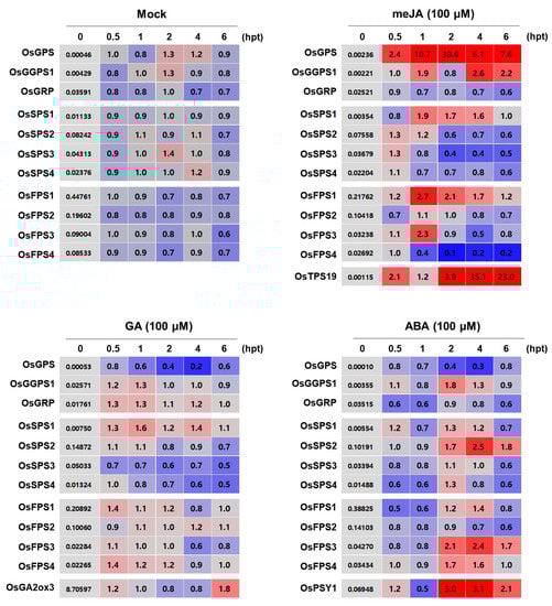 Expression profiles of rice trans-PTs in response to different hormone treatments in 10-day-old leaves. The heatmap graphs are presented by the relative fold-change expression in comparison to their respective controls. The ΔCt values of each time point (0, 0.5, 1, 2, 4 or 6 h) post treatment (hpt) were calculated by the ΔCt equation against the OsEF1α gene and the relative fold-change values (2−ΔΔCt) of each time point were obtained by the normalization using the ΔCt values of each 0 h time point as a respective control. The 0 h time points of each treatment are presented using the ΔCt values in the gray colored boxes and other time points are displayed using the fold change values. The color key of the heatmap graph is presented under the last graph. The results are expressed as the mean values of three technical repeats and also listed in Table S7. Mock, with no chemical; meJA, methyl jasmonic acid; GA, gibberellic acid; ABA, abscisic acid.